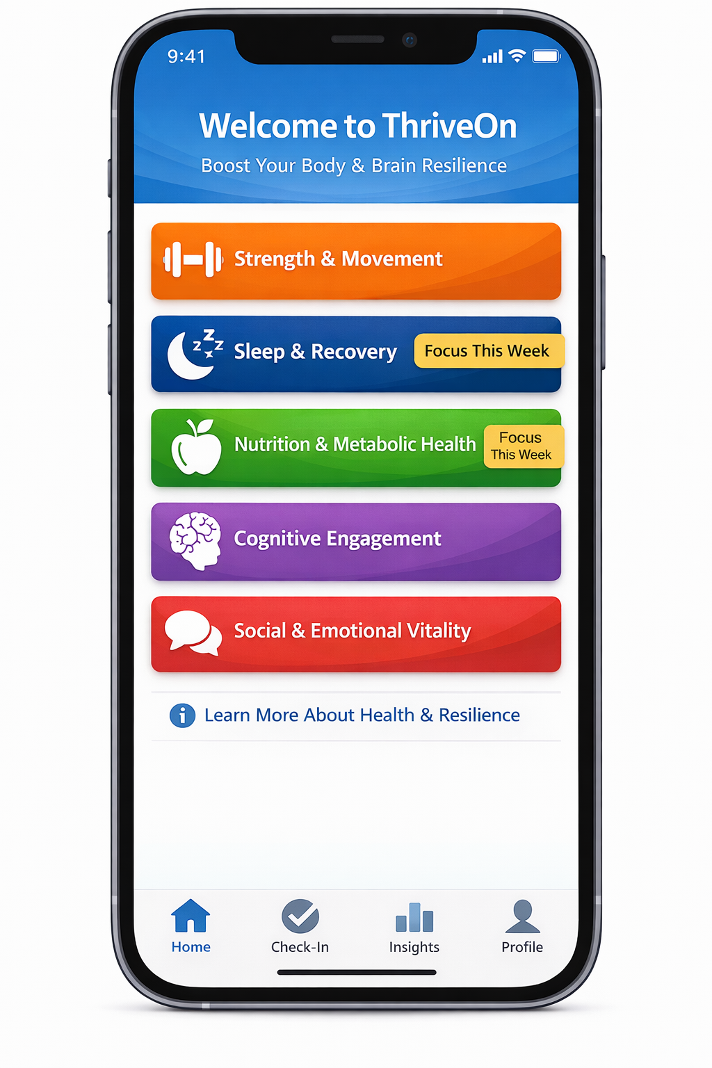 Thrive On is a guided wellness platform designed to help people stay strong, sharp, and energized as they move through life.